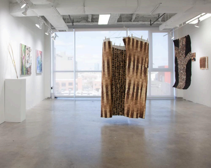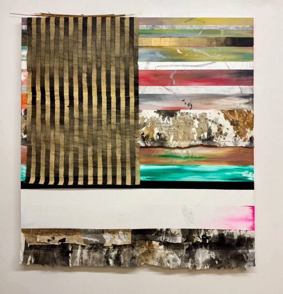 《模糊》 布面油畫,丙烯,宣紙,墨水, 竹子, 金屬零件 58 x 58 x 2 英尺 2025